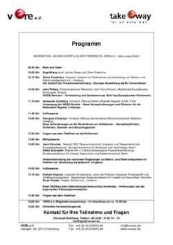 As already brought together in Berlin 70 members of all over Germany at the event last year under the motto "Product Responsibility – a solvable Challenge?" the VERE Association and take-e-way will also this year create a platform, on which all interested parties from companies and organizations will be informed about law amendments, discuss improvements with one another and be able to establish contacts.